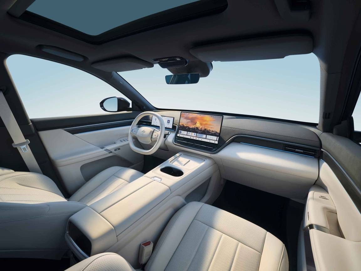 新车最直观的升级来自视觉层面。与“中国国家地理”共创的两款新配色——“仙踪绿”和“苍穹灰”,直接将大兴安岭的森林与青藏高原的天空“搬”到了车身上。这种高级感的背后是实打实的工艺升级:漆面配方可保证12年不褪色,阳光下依旧流光溢彩。5米的车长搭配超3米轴距,线条舒展大气,既不失商务车的稳重,又带着新能源时代的科技感。