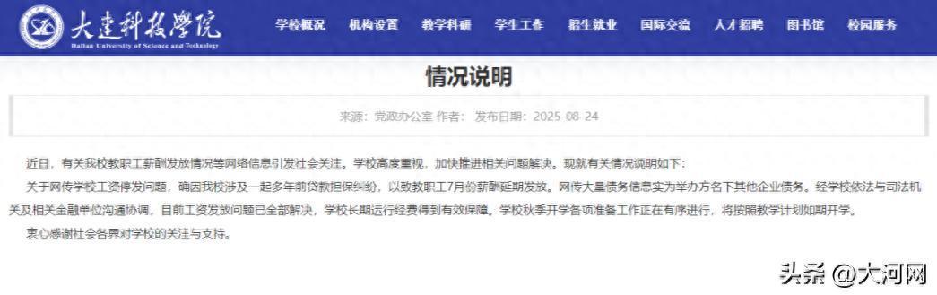 近日,有网友发帖称“大连科技学院全员停发工资,开学面临停摆”,引发关注。在帖文评论区,记者注意到有一封落款为“大连科技学院工会委员会”的《致全体教职员工一封信》。信中提到,在未收到任何法律文书和通知的情况下,学校各类相关账户被大连市中级人民法院冻结,致使7月工资未能如期发放。学校工会将为全体教职员工发放临时困难补贴和慰问补贴。