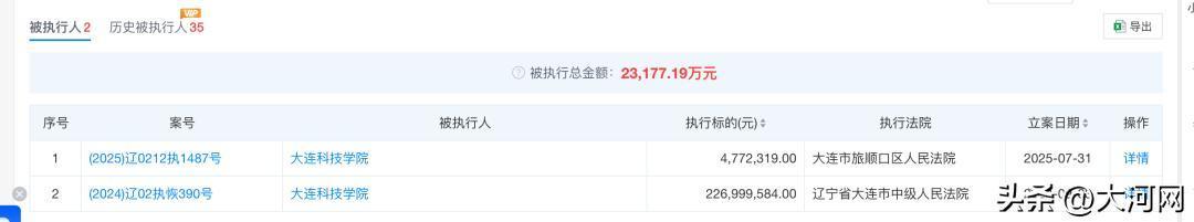 ▲大连科技学院2条被执行人信息,总金额超2.3亿元。