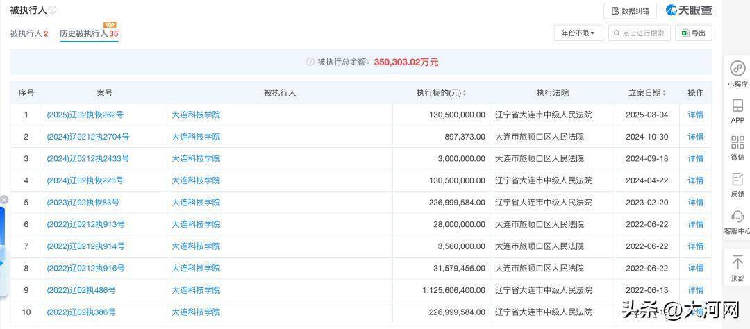 ▲大连科技学院历史被执行人信息共35条,总金额超35亿元。